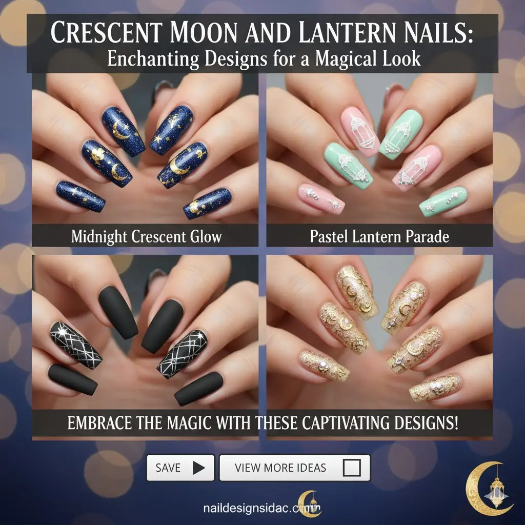 Pair crescent moons with tiny lantern motifs for a festive Ramadan to Eid transition manicure.